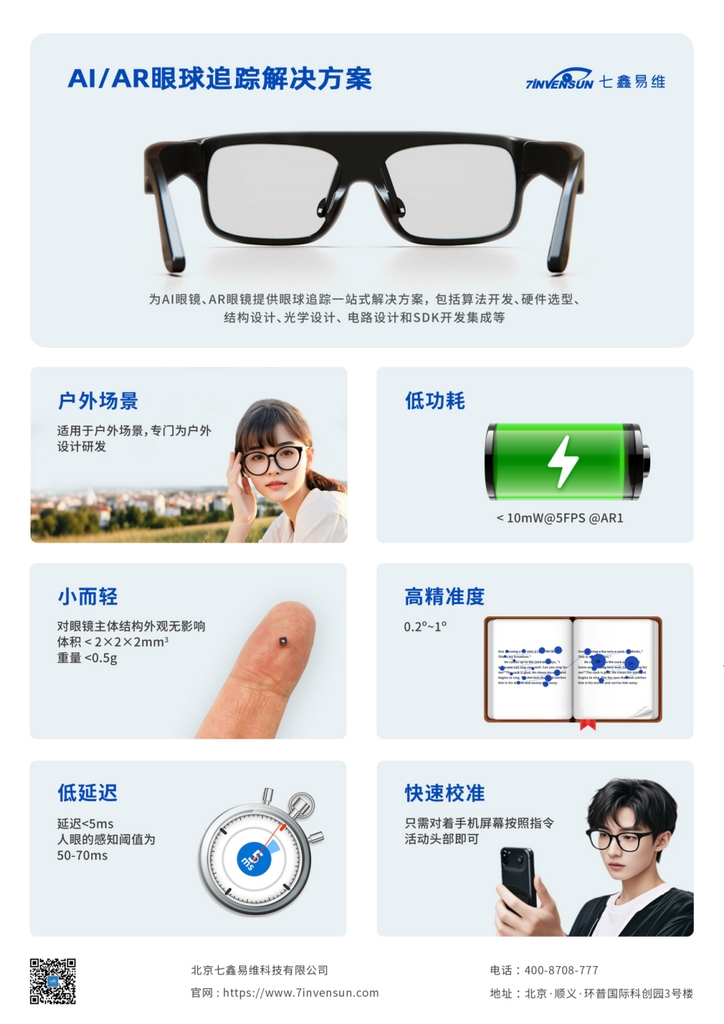 七鑫易维科技有限公司成立于2009年,深耕眼球追踪(Eye Tracking)技术十六年,是全球领先的机器视觉与人工智能企业。公司业务涵盖XR/AI智能设备、医疗健康、智能驾驶与消费电子等领域,已为全球超1000家标杆客户提供眼动技术支持,并积极推动眼动追踪技术在AI/AR智能眼镜等新兴领域的落地。未来,七鑫易维将持续引领AI视觉交互技术创新,让世界读懂你的眼神。